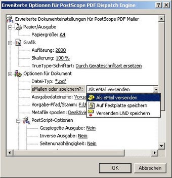 PostScope PDF Dispatch Engine arbeitet als virtueller Druckertreiber und bietet entsprechende Optionen an. So stellt man die Grafikauflösung für Bitmaps, die Skalierung oder die "Papiergröße" ein. Auf Wunsch versieht PostScope PDF Dispatch Engine die erstellte PDF-Datei mit einem eigenen Wasserzeichen und verschickt das Dokument über ein auf dem Rechner installiertes E-Mail-Programm.